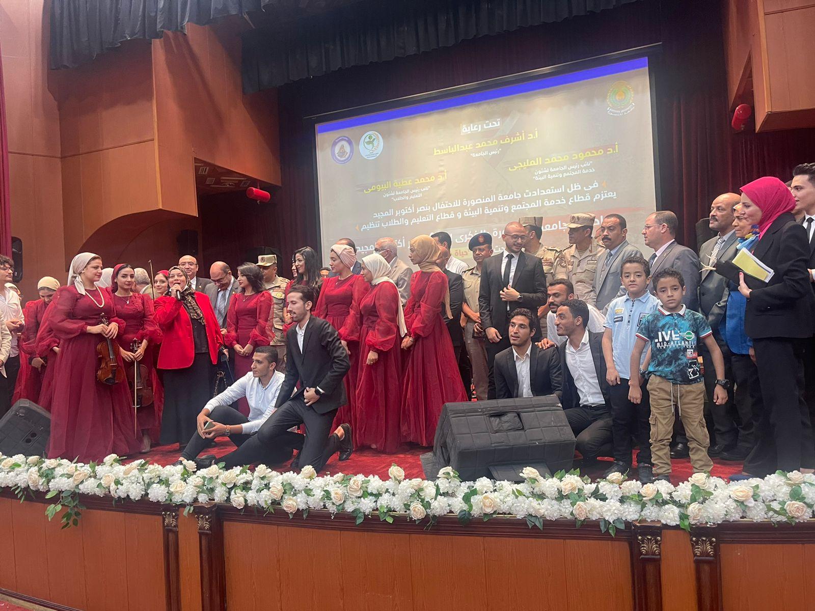 لقد قامت جامعة المنصورة برئاسة الأستاذ الدكتور أشرف عبد الباسط رئيس جامعة المنصورة والسيد الدكتور أيمن مختار محافظ الدقهلية والسيد المستشار العسكري لمحافظة الدقهلية المستشار العقيد تامر العوضي ومدير ادارة التربية العسكرية بجامعة المنصورة العميد وائل محمد والعقيد خالد محمد عادل وعمداء الكليات المختلفة داخل جامعة المنصورة ولفيف من القيادات والشخصيات العامة في المجتمع وتحت إطار فعالية : في ظل استعدادات جامعة المنصورة للاحتفال نصر أكتوبر المجيد يعتزم قطاع خدمة المجتمع وتنمية البيئة وقطاع التعليم والطلاب تنظيم احتفال جامعة المنصورة بالذكري ٤٨ لنصر اكتوبر المجيد تحت شعار حياة كريمة” .