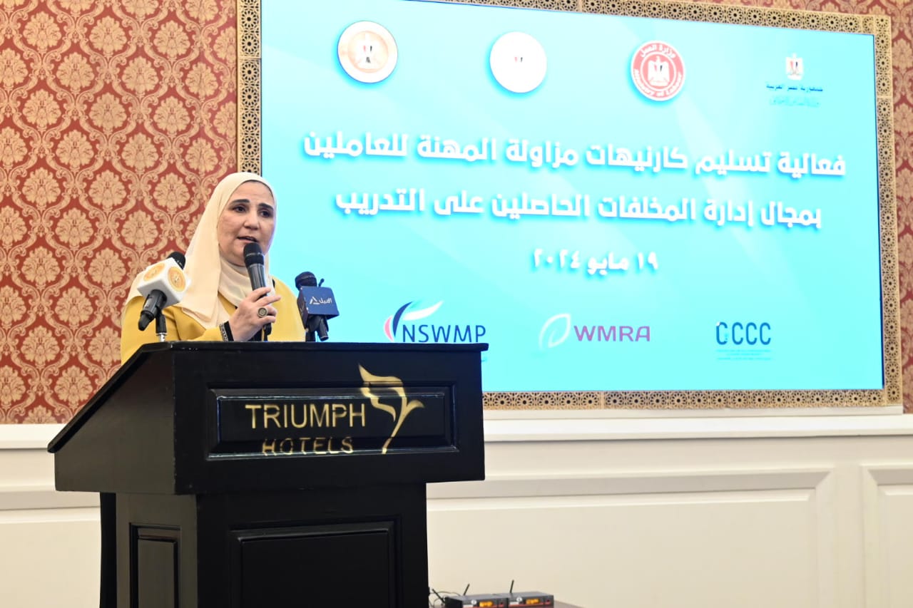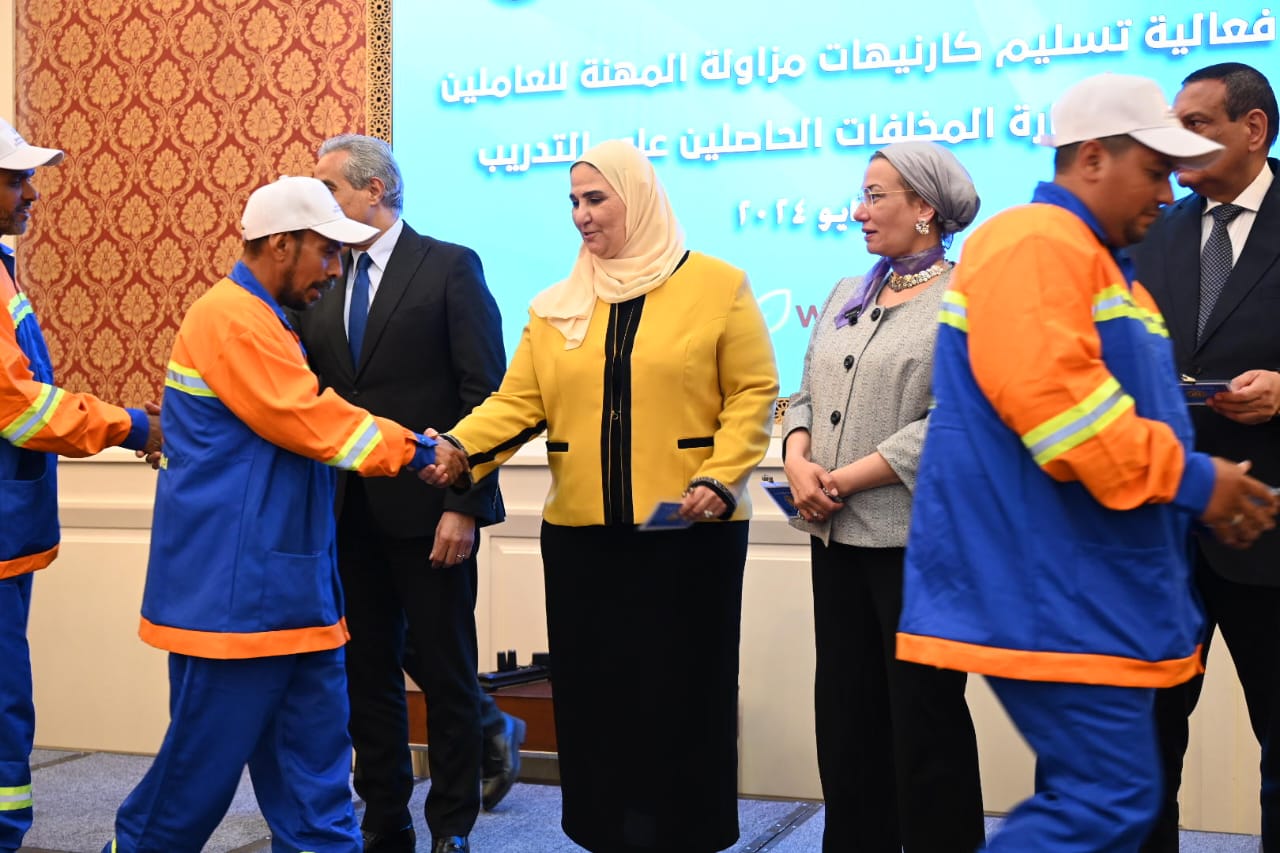 واستكملت الدكتورة ياسمين فؤاد ان البرنامج التدريبى المنفذ تم تقسيمه الى شق فنى خاص بجهاز تنظيم ادارة المخلفات حيث تم تخصيص محتوى تدريبى لكل مسمى على حده، وشق ثانٍ خاص بوزارة العمل يختص بالسلامة والصحة المهنية، وآخر خاص بالحوافز التأمينية من وزارة التضامن الاجتماعى، وعقب عملية التدريب تم إجراء اختبار قياس المهارة وحصول العامل على كارنية مزاولة المهنة والذي تصدره وزارة العمل لتمكين العمال من تغيير المسمى الوظيفى ببطاقه الرقم القومى، مع وضع ضوابط للحاصلين على المسميات بعدم العمل بهذه المسميات منفرداً، بل من خلال الشركات الحاصلة على الترخيص من جهاز تنظيم ادارة المخلفات، على أن تقوم تلك الشركات بتوفير كارنية للعامل بعد التحاقه بالعمل معهم بعد تقنين وضعه ويجدد كل ٦ أشهر، وسيتم استكمال البرنامج التدريبى فى باقى محافظات الجمهورية.