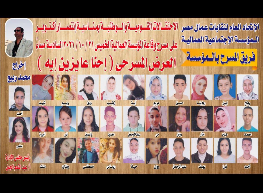الحفله تحت اشراف واخراج محمد ربيع الاستشاري الفني احمد الاصور وتحت رعايه مجلس اداره المؤسسه العماليه عبد المنعم الجمل