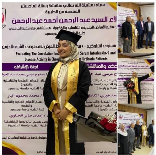 هذا وتقدمت الباحثة الدكتورة الاء بالعديد من الأطروحات وأهداف الرسالة واهم التوصيات بموضوع الرسالة بتقييم العلاقة بين مستوى انترلوكين – ٩ فى الدم ونشاط المرض لدى مرضى الشرى المزمن العفوى ونالت بجدارة منحها درجة الماجستير بامتياز هذا وتم تكونت لجنة الاشراف من كلا من الأساتذة